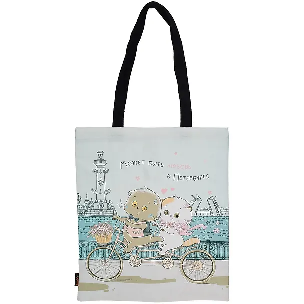 Я в восторге от этой сумки! 😍 Стильный дизайн с милыми котиками, катающимися на двойном велосипеде по Санкт-Петербургу, - любовь с первого взгляда! Надпись добавляет сумке особый шарм и романтичность.