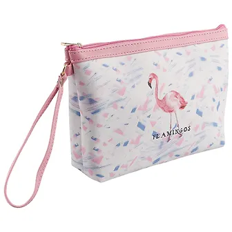 Клатч, в который поместится небольшой набор косметики, телефон, кошелёк и ключи, оценят молодые девушки. Посмотрите, какой славный фламинго вышагивает на фоне ярких пятнышек краски! Снаружи сумка из кожезаменителя, а значит, справится с дождём или падением в морские волны, а внутри у неё тканевая подкладка, которую легко постирать. У клатча есть небольшая ручка-петелька, поэтому его удобно носить с собой.