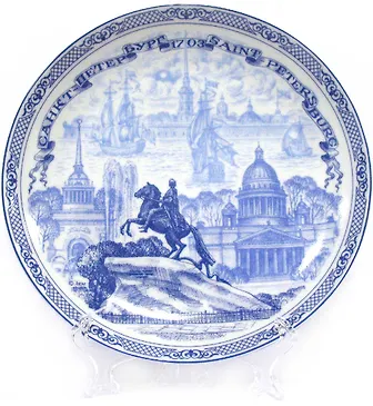 Сувенир, Акм, Тарелка, Медный всадник, 20 см, под гжель, подставка, в коробке