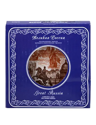 Сувенир АКМ «Тарелка „Медный всадник“» (коричневый рисунок, диаметр 10 см) с подставкой в коробке (артикул 10-7BR-03) — это фарфоровая декоративная тарелка с изображением памятника «Медный всадник» в коричневых тонах. В комплект входит подставка и упаковка.