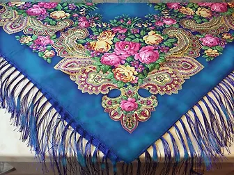 Платок с цветами и бахромой 1х1 м.голубой,состав шерсть+вискоза,рекомендуется деликатная стирка