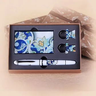 Подарочный набор, состоящий из двух брелков, визитницы и ручки, порадует каждого. Оригинальные и функциональные аксессуары подчеркнут изысканный вкус своего владельца. Предметы набора хранятся в подарочной картонной коробке.