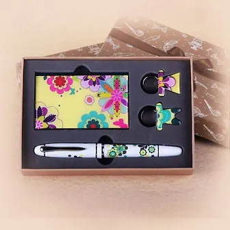 Подарочный набор, состоящий из двух брелков, визитницы и ручки, порадует каждого. Оригинальные и функциональные аксессуары подчеркнут изысканный вкус своего владельца. Предметы набора хранятся в подарочной картонной коробке.