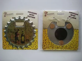 Ключ для открывания бутылок представляет собой подставку под пивной стакан с отверстием, предназаначенным для удобного снятия металлических пробок с бутылок. На лицевую сторону нанесен тематический дизайн, на оборотной стороне закреплен магнит и три пробковые защиты, которые позволяют предотвратить повреждение поверхности стола.