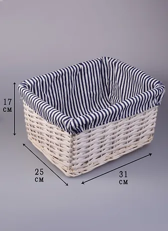 Короб для хранения "Голубая полоска M" размером31х25х17 см, выполнен из плетеных ивовых прутьев (обработанных антисептиком, окрашенных тонировочной краской, покрытых лаком), с внутренней частью из ткани (50% хлопок, 50% полиэстер).Прекрасно подойдет для вашего интерьера, практичный короб для любого хранения.
