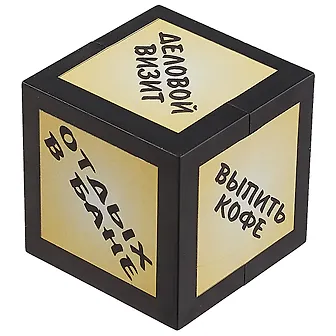 Копеечная безделушка в районе ста рублей, но прикольная, для смеха и развлечения вообще классно. мы теперь на работе с коллегами пользуемся кубиком каждый день, когда не знаем, как скоротать свободное время на работе))) Кубик сделан их толстого картона, стенки не проминаются, когда бросаешь кубик на стол. Но надавливать конечно на него нельзя. Если предложенные идея надоедят, то можно свои варианты наклеить на кубик.