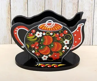 Деревянные хохломские вазы для фруктов, салфетницы, тарелки и чашки - все они украшены чудесными орнаментами в русском стиле. Пышные и оригинальные формы посуды придадут стиль любому кухонному интерьеру и благоприятную атмосферу. Салфетница в виде чайника идеально впишется к любой чайной трапезе и не останется незамеченной.
