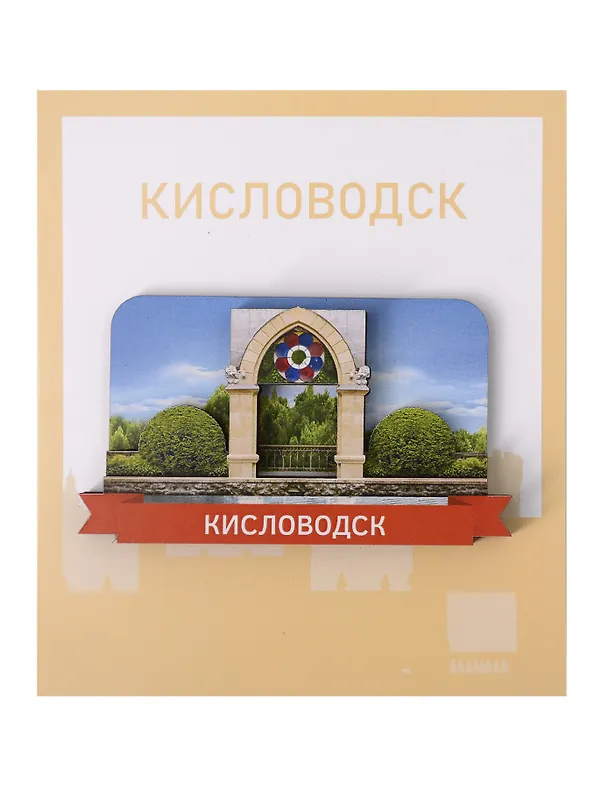 Деревянный магнит с изображением беседки над Зеркальным прудом в Кисловодске. Изделие выполнено из дерева, имеет изображение беседки в курортном парке. Эта беседка является одной из ярких достопримечательностей Нижнего парка Кисловодска. Она расположена на берегу Зеркального пруда и представляет собой неоготический павильон с витражами и каскадами воды, получившими название «стеклянная струя».