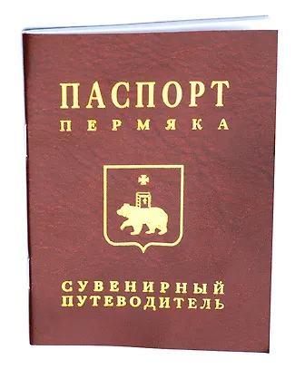 Оригинальный сувенир-путеводитель. Содержит место для фотографии владельца, карту центра Перми, около 40 фотографий достопримечательностей города, текст на русском и английском языке, необходимые телефоны гостиниц, музеев, театров. Форма «паспорта» напоминает гостям и жителям города, что именно Пермь, точнее Пермский Гознак, обеспечивает всю страну паспортами.