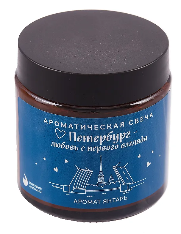 Ароматическая свеча в стеклянной баночке СПб Петербург-любовь с первого взгляда с тёплым янтарным ароматом наполняет комнату мягким светом и уютом. Прозрачное стекло и аккуратное оформление с городскими мотивами превращают её в небольшой сувенир о поездке или мечте о Северной столице.