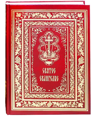 Святое Евангелие на русском языке с зачалами, среднего формата. Текст отпечатан крупным шрифтом, содержит богослужебные зачала. Использован твердый переплет.