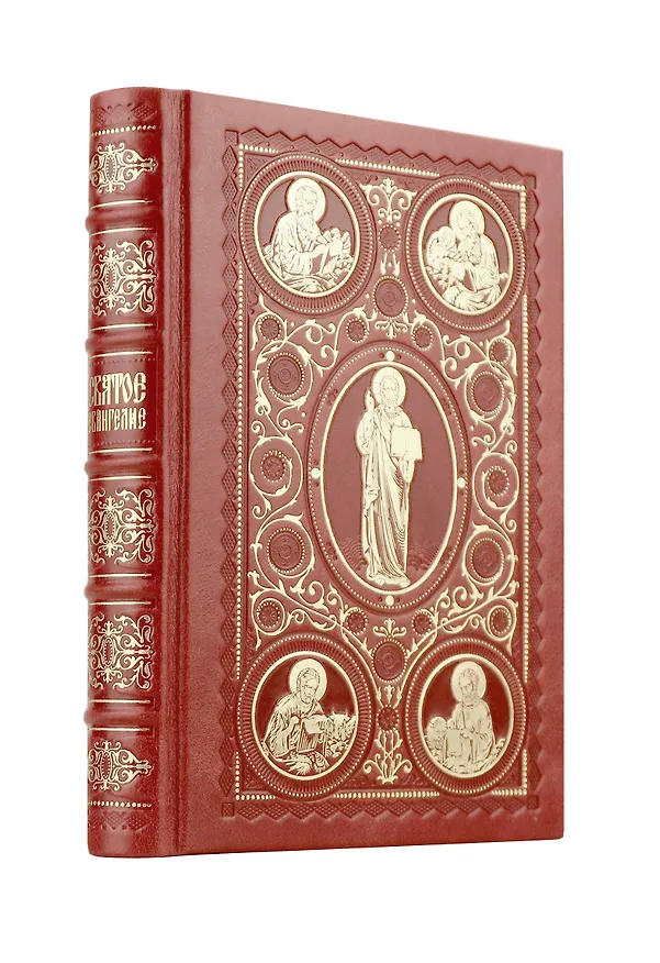 Коллекционное издание Святого Евангелия со множеством иллюстраций. Книга отпечатана на гладкой белой бумаге, сшита вручную, украшена византийскими орнаментами. Переплет из гладкой алой кожи изготовлен по традиционной технологии XIX века и украшен изящным тиснением. Форзацы из хлопковой бумаги, обрез обработан вручную, каптал и ляссе — шелковые. Сертификат, подтверждающий уникальность коллекционного переплета, вложен в каждый экземпляр и пронумерован вручную.