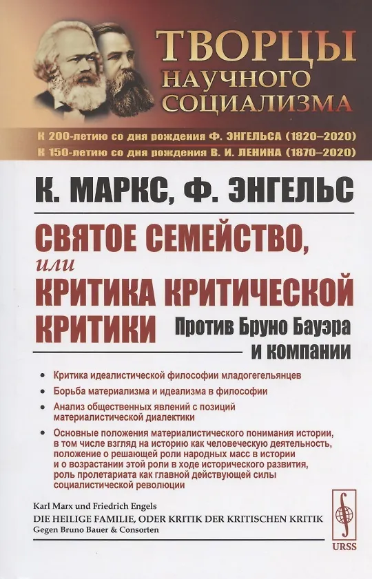 Вниманию читателей предлагается первая совместная работа Карла Маркса и Фридриха Энгельса, написанная ими с сентября по ноябрь 1844 года и вышедшая в свет в 1845 году. В книге с материалистических позиций критикуется идеалистическая философия младогегельянцев, братьев Бруно и Эдгара Бауэров и их последователей. Авторы освещают борьбу материализма и идеализма в философии, подчеркивают связь идей материализма с идеями утопического социализма и развитием естествознания, анализируют общественные явления с позиций материалистической диалектики. В этой работе были сформулированы основные положения материалистического понимания истории, в том числе взгляд на историю как человеческую деятельность, п