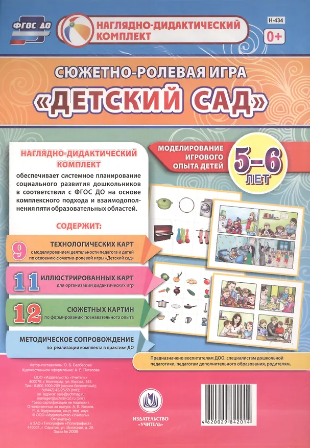 Предлагаемый наглядно-дидактический комплект включает 9 технологических карт, позволяющих комплексно, целостно и последовательно планировать образовательную деятельность по обогащению социального опыта детей 5-6 лет на основе содержания сюжетно-ролевой игры "Детский сад" в течение учебного года. Представлены также иллюстрированные разрезные карты и красочные сюжетные рисунки (23) для организации бесед, наблюдений, составления рассказов, дидактических игр обучающего и развивающего назначения, соответствующие теме.