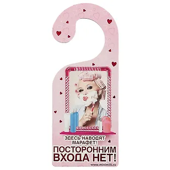 У таблички две стороны, с разрешающей и запрещающей надписью. Обе очень забавные. Табличка на дверь «Здесь наводят марафет» будет отлично смотреться на ручке двери на работе.