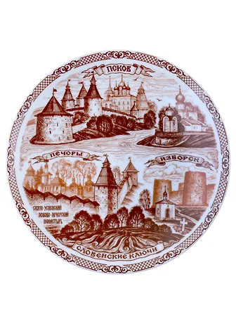 Тарелка фарфоровая коричневый рисунок D15 "Псков - Печоры - Изборск"