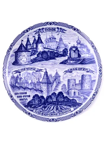 Тарелка фарфоровая синий рисунок D20 "Псков - Печоры - Изборск"