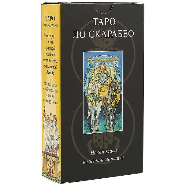Колода Ло Скарабео была создана на юбилей издательства. В целом картинки очень хорошие. это русская версия, совсем чуток подкачало качество картона, но в целом, думаю хватит ее на долго, если не пользоваться ежедневно. Сюжет и энергетика светлые, мне очень понравилось. Отвечает на вопросы четко, лаконично, схоже с классикой.. Советую к покупке.