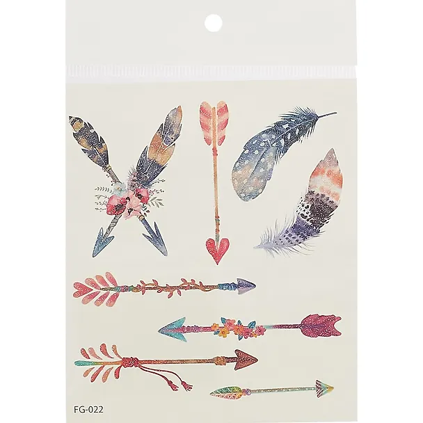 Переводные татуировки – это простой и занимательный способ внести что-то новое в свой образ. Блестящие пёрышки, стрелы или крылья украсят вас и будут ярко переливаться на солнце. Посмотрите, как красиво!