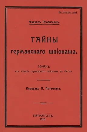 Репринт с издания. Петроград, 1915. Эдвард Филлипс Оппенхейм (Edward Phillips Oppenheim; 1866-1946) родился в семье скорняка в Leicester. Он не получил серьезного образования, и с раннего возраста, в течении 20 лет, работал в компании отца по производству кожи, а по ночам сочинял романы. Первый роман Оппенхейма "Искупление", был издан в 1887 и сразу же принес писателю популярность, он был экранизирован в 1922. Издав около 30 книг, в 1906 40-летний Оппенхейм, наконец, продал отцовский бизнес и поселился на Французской Ривьере, где вел роскошный образ жизни, устраивая приемы на своей яхте, а в свободное время наведываясь в Монте-Карло. Оппенхеймер был единственным писателем 20 века, кто держал
