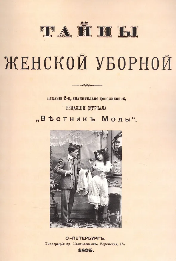 Репринт с издания. 1895. Издание журнала "Вестник Моды". Оглавление: Уборная—святилище женщины., Часть I. Уборная и ея принадлежности. Ванная и ея принадлежности., Часть II. Уход за различными частями тела. Лицо. Волосы и прическа. Рот. Рука. Интимный туалет женщины., Часть III. Косметики. Косметиши для волос. Помады. Краски для волос., Часть ІV. Нижняя одежда женщины., Дополнение. Разные рецепты.