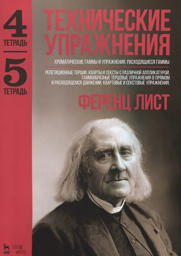 «Технические упражнения» величайшего венгерского пианиста и композитора, Ференца (Франца) Листа в России издаются впервые. 12 тетрадей упражнений представляют собой великолепный материал для рациональной структурированной работы пианиста над технической составляющей исполнительского мастерства. Четвёртая часть включает хроматические последовательности: хроматические гаммы в сексту и терцию; а также упражнения на расходящиеся гаммы. Лист использует специфическую аппликатуру, которая встречается в произведениях концертного репертуара пианистов. Пятая тетрадь "Упражнений" связана с техникой двойных нот. Издание принесет неоценимую пользу концертирующим пианистам, студентам и педагогам исполните