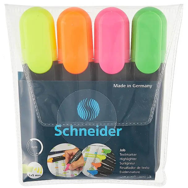 Текстовыделители 04цв "Job", 1-5мм, блистер, SCHNEIDER. Купила набор этих текстовыделителей потому что мне понравились яркие цвета. Из этого набора больше всех мне понравился жёлтый цвет. Пользуюсь этими текстовыделителями 4 месяца и не один не засох. Ещё они не занимают много места и их удобно держать в руке. Я очень довольна что купила этот набор.