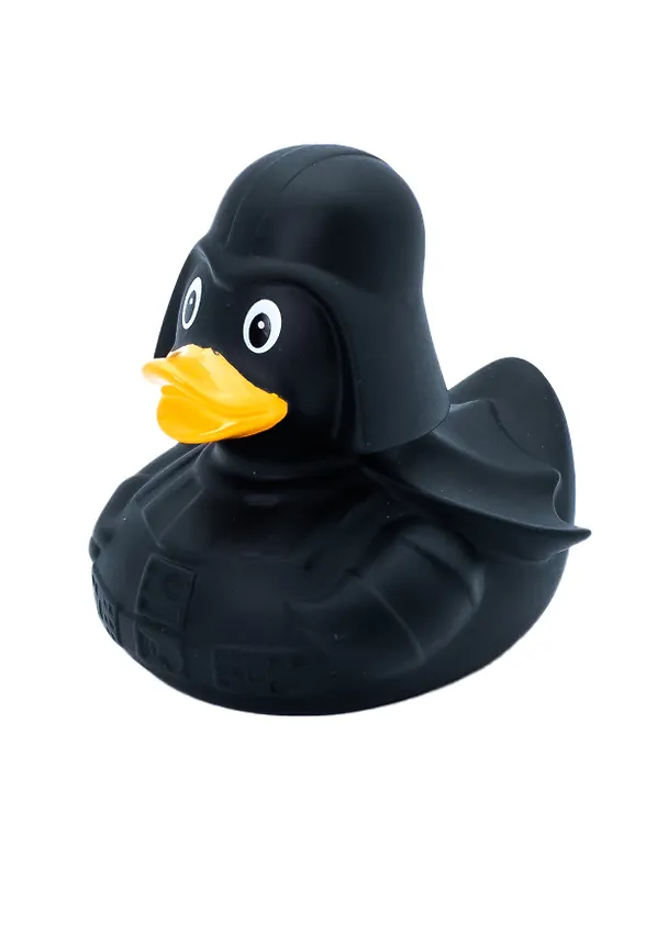 Уточка Темный лорд стилизованная под Темного лорда из легендарного цикла фильмов «Звездные войны». Можно не сомневаться, что такой игрушке будет рад как ребенок, так и взрослый поклонник киношедевра, не лишенный чувства юмора. Уточка Темный лорд имеет стандартные для коллекции типоразмеры. Изделие окрашено в насыщенный черный цвет, за исключением клюва – он ярко-оранжевый. Мордашка игрушки детализирована и очень симпатична. Крупные глаза доброжелательны, что несколько диссонирует с самим прототипом Темного лорда. Уточка хоть и стилизована под негативный персонаж, смотрится очень добродушно, поэтому точно не напугает маленького адресанта. Производитель особое внимание уделил детализации костю