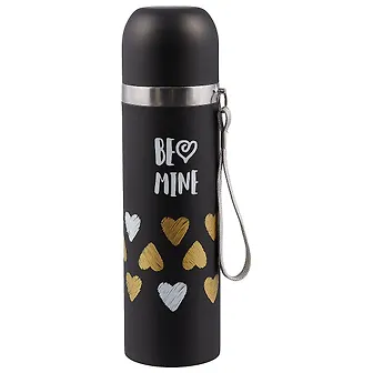 Термос «Яркие детали» станет отличным подарком для человека, который вам нравится. Он полностью чёрный, но украшен белыми и золотистыми сердечками. Термос удобно носить с собой, потому что у него есть небольшой серебристый ремешок. Крышку можно использовать как чашечку.
