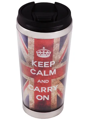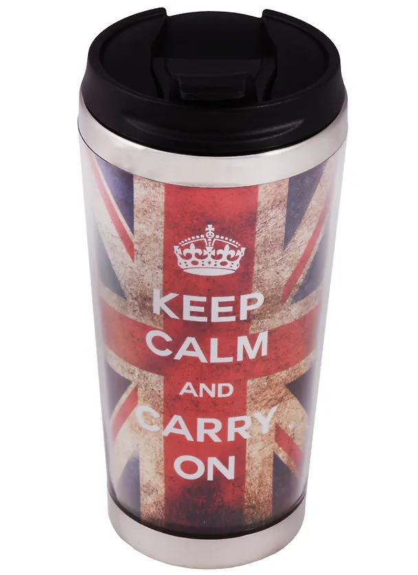 Термостакан «Британский флаг» изготовлен из нержавеющей стали и пластика.