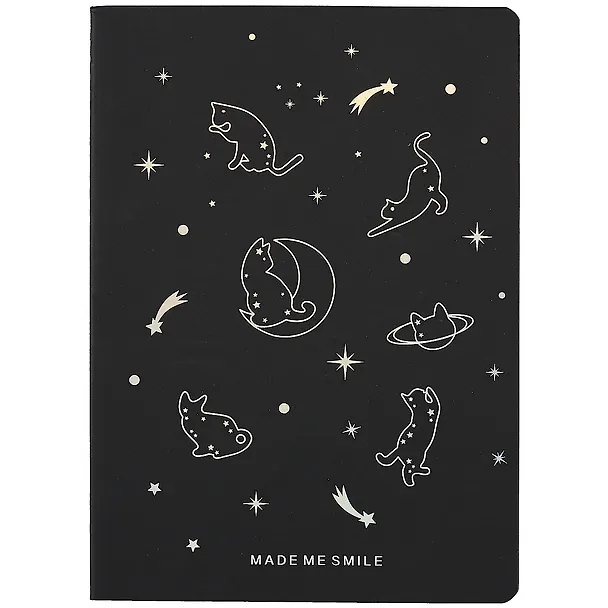 Нереально красивая тетрадь на сшивке с чёрным блоком. На идеально-чёрной, приятной наощупь, поверхности изображены белые контуры котов, звезды и планеты. Выглядит это всё ну нереально классно, в самой тетради качественные страницы, хоть их и не много, что за такую цену я считаю неоправданно. Но тетрадь скорее подарочная, думаю будет приятно добавить к основному подарку