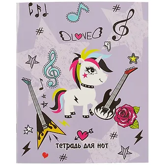 Тетрадь для нот 24 л. арт. 49988 РОК И ЕДИНОРОГ /А5, белый офсет, мягкий переплёт (2 скобы), облож.- мелованный картон 190 г/м2, глянцевая ламинация, расширенный нотный стан,