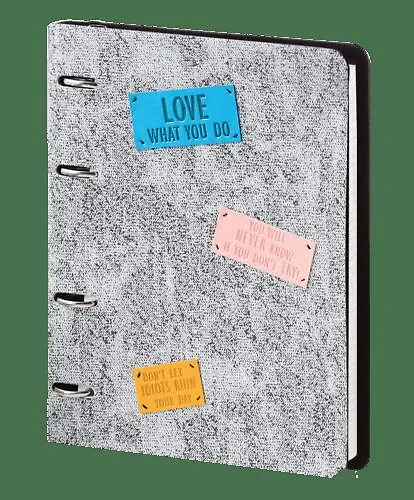 Обложка: снаружи - дизайнерская искусственная кожа, 3 декоративные нашивки с блинтовым тиснением на лицевой части; внутри - черный картон 500г/м2. Кольцевой механизм. Внутренний блок: офсетная печать, бумага 100% белизны, 65г/м2. Дизайн внутреннего блока "в клетку".