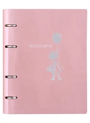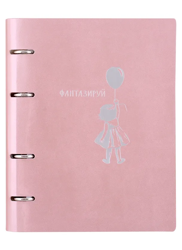 Приятная обложка вызывает у меня улыбку и интерес к новому: перламутровый пудровый цвет, тиснение "Фантазируй" с изображением девочки с воздушным шаром серебристого цвета. Удобный сменный Внутренний блок бумаги в клетку - можно заменить отдельно продающимся сменным блоком после использования. Бумага приятная на ощупь, без расчерченных полей. Есть поля (около 1 см) по периметру страницы. Клетка расчерчена точками (не классическими линиями). Кольца крепления металлические.