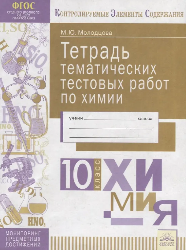 Тетрадь тематических тестовых работ предназначена для мониторинга предметных достижений десятиклассников по основным темам курса химии и позволяет целенаправленно готовить учащихся к различным процедурам внутренней и внешней оценки, в том числе к итоговым работам за год, ЕГЭ, ВПР. Тестовые задания разработаны на основе Кодификатора элементов содержания и требований к уровню подготовки выпускников образовательных организаций для проведения единого государственного экзамена по химии. Благодаря этому проверяется только тот учебный материал, который подлежит обязательному контролю при оценке качества образования.