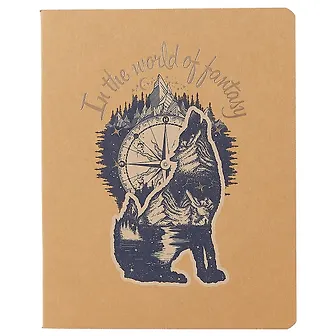 Обложки этих тетрадей сделаны из крафтового картона и украшены изображениями скал, волка, саксофона и компаса.