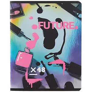Мне пришла тетрадь с изображением помад и надписью "Future", обложка из плотного картона, поэтому её не нужно дополнительно оборачивать. Рисунок яркий, с эффектом металлик, красиво переливается. Листы закруглённые, белые, плотные, с полями, написанный ручкой текст не просвечивает с другой стороны. Клетка ровная, хорошо пропечатана.