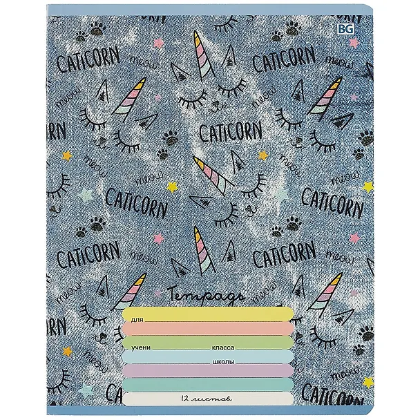 Тетрадь для маленькой модницы! На джинсовой текстуре расположились забавные бабочки, надписи и мордочки чудесных существ – котят-единорогов. Разве не прелесть?