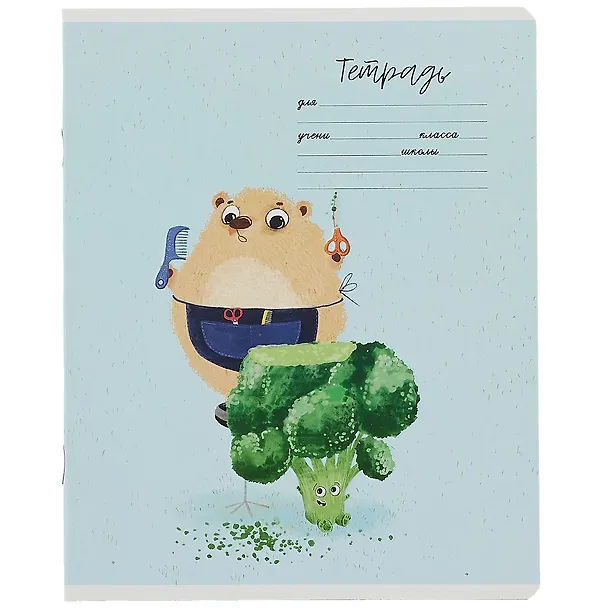 Рисунок - прелесть! Нестандартный, весёлый, креативный, "с изюминкой". Основной рисунок яркий и глянцевый, фон остальной обложки - бледный, нежный, матовый. Сзади таблица умножения. Обложке дала бы 30-40% плотности, до середины не дотягивает. Края закруглённые. Листы белоснежные, лощёные. Клетка с полями в меру яркие, 50 на 50. В целом отличное качество тетради.