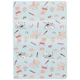 тонкая бумажная тетрадь в 32 листа в клетку на прошивке, а не на скобах. обложка из тонкого полуглянцевого картона, очень яркий и четкий принт с мультяшными изображениями разнообразных кроликов, морковок, радуг и облаков.
