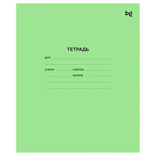 Тетрадь BG с зеленой обложкой состоит из 18 листов и предназначена для дошкольников и учащихся начальных и средних классов. Изготовлена в соответствии с ГОСТ Р 54543-2011. Внутренний блок – это офсетная бумага плотностью 60-65 г/м², белизна 100 %, линовка – клетка с полями, тип скрепления – скрепка. Обложка также изготовлена из офсета плотностью 80 г/м2.