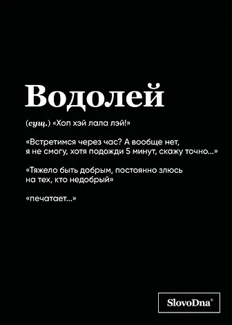 Теперь об обложке, отдельный вид искусства и главное точно описаны черты характера и поведения Водолея. Купила в подарок водолею, просто про нее все описано, надписи-идеальный тонкий юмор. Красиво смотрится, обложка черная и белая надпись.