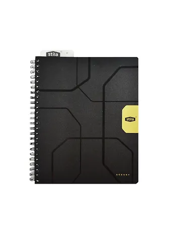 Обложка тетради из приятного шероховатого пластика, жёлтый элемент, который яркий на фотографии, в реальности наполовину бледнее и кажется серо-жёлтым.