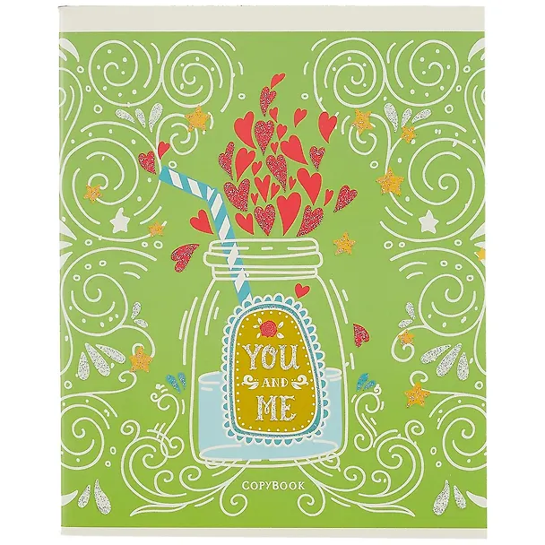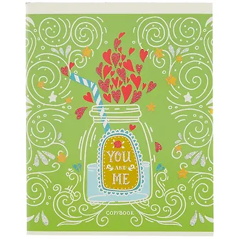 Как я понял тетрадь отправляют со случайной картинкой на обложке(всего их 5),мне к сожалению досталась слишком уж девчачья с сердечками и надписью "you and me"(ты и я).Сама тетрадь неплохая,листы и обложка плотные,достаточно толстые,рисунок на обложке глянцевый,клетки хорошо напечатаны,чёткие,тетрадь приятно держать в руках.Из недостатков это ширина полей,они на части листов-три клетки,на другой-четыре,для кого-то это может быть принципиально.