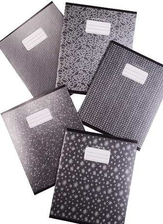 Тетради А5 48л. Скрепка. Клетка. Обл.:мел.карт, пятая кр.графит, тисн.фольг.серебро.Бум. оф.60 г/м2. Графит (орнамент) 48л., 5 видов