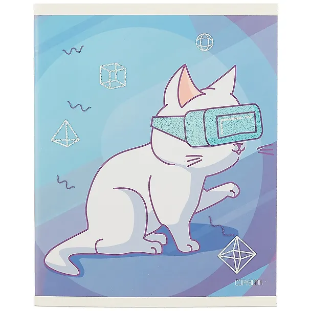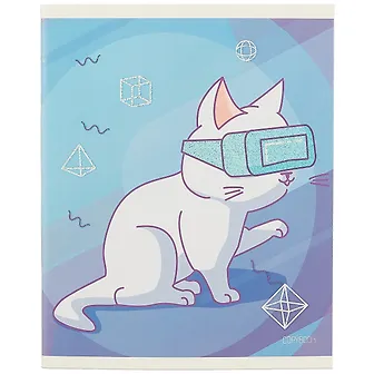 Тетрадь на 48 листов со светлыми страницами в голубую клеточку. Немного криво напечатана, но не критично. Яркая обложка с блестками. Плотная картонная обложка. На обороте рисунок кота с коробкой