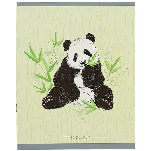 Тетрадь общая с хорошей плотной картонной обложкой. Обложка гладкая, глянцевая. На светло-зеленом фоне, прямо по центру изображена милая добродушная панда. Одна лапка приподнята вверх, как бы приветствуя окружающих. На заднем фоне, за спиной животного выглядывают несколько стеблей бамбука. Внутри 40 белоснежные листов в широкую линию.