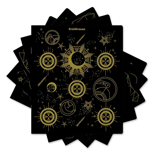 Тетрадь общая формата А5+ (170х203 мм). Обложка из высококачественного крашенного в массе черного картона плотностью 180 г/м2. Отделка обложки - тиснение золотой фольгой. В блоке 48 листов в клетку с полями. Бумага офсетная плотностью 60 г/м2. Белизна бумаги - 100%. Цвет линовки - синий. Скругленные уголки обложки и блока. Тип скрепления - скоба. Тетради упакованы в термоусадочную плёнку по 5 штук.