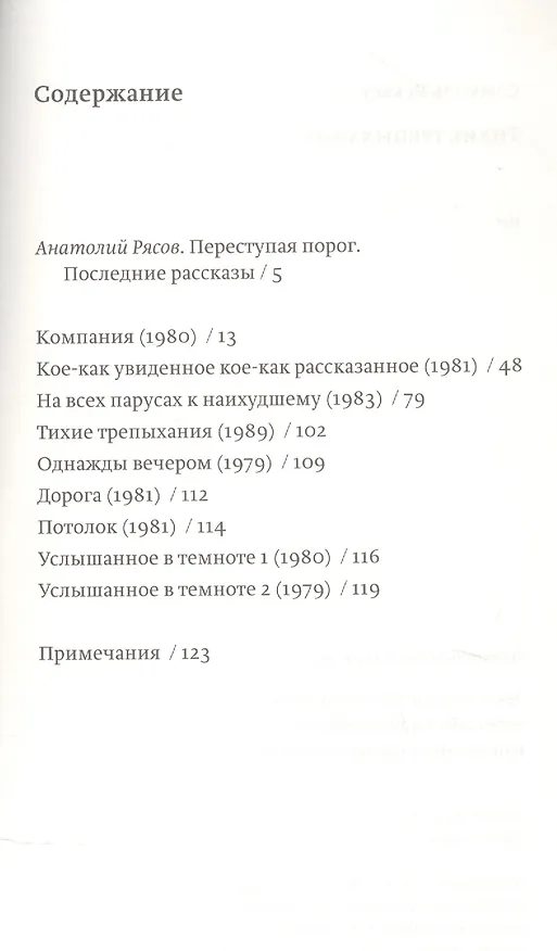 Этот сборник — первое на русском языке издание поздней прозы Сэмюэля Беккета, включающее все рассказы, написанные им в последние десять лет жизни. Самый поздний из них, «Тихие трепыхания», был напечатан всего за несколько месяцев до смерти писателя. В 80-е годы в текстах Беккета разворачивается новый способ высказывания. В повествовании, которое поначалу кажется лишенным каких-либо красок, находится место для автобиографических мотивов, а аллюзии на Данте или Шекспира еле приметно вспыхивают в сумрачной тишине, обволакивающей застывших персонажей.