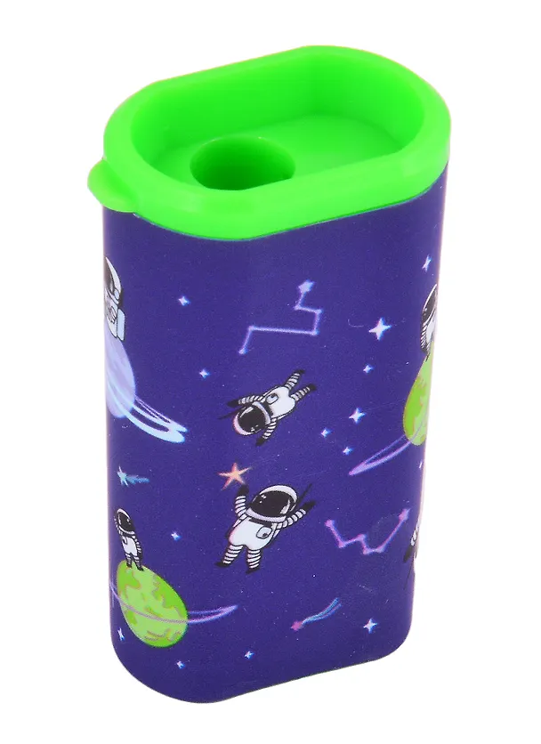 Точилка понравилась, Выполнена из прочного пластика, корпус украшен космическим принтом, крышка плотно приерепляется к корпусу, за длительный период времени крышка не ломалась. Очень нравится, что сама точилка скрыта в корпусе, при этом проблем очистить корпус от карандашных стружек полностью нет. Корпус достаточно большой, что позволяет использовать точилку, не чистя ее постоянно.